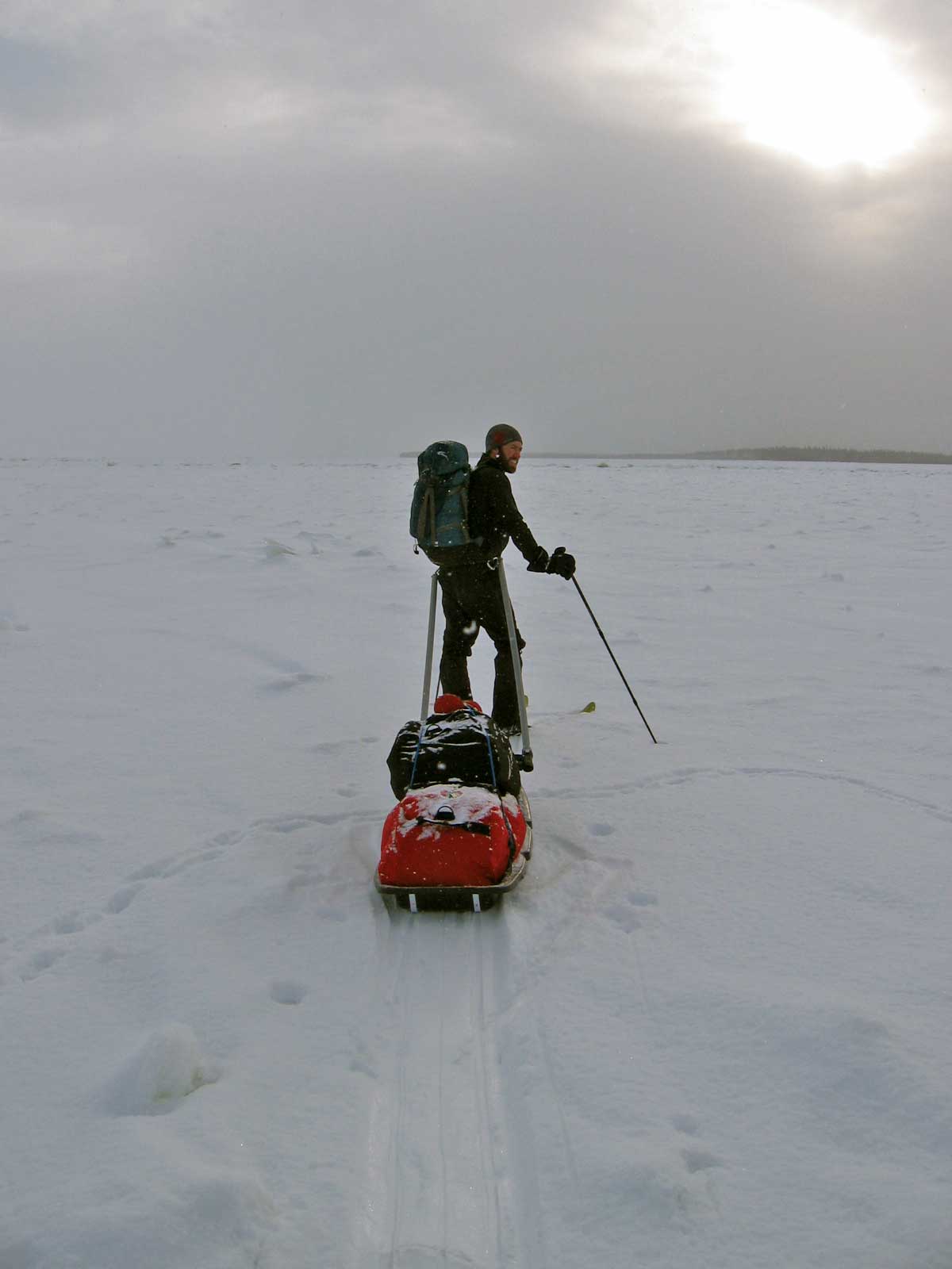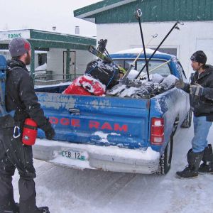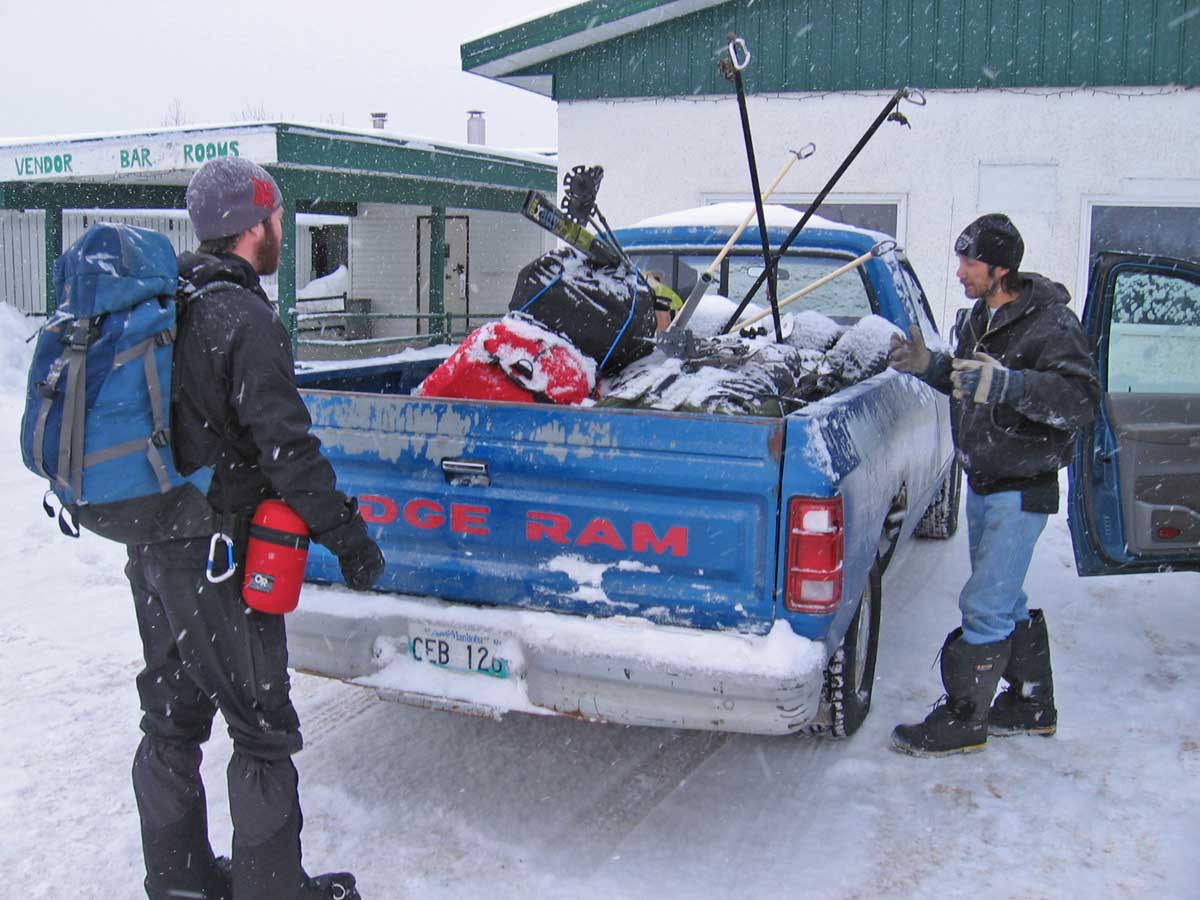 Dennis the owner of the Northbrook Inn arranged us a shuttle with a few of his staff; we loaded up the back of an old pick up truck and got a ride down to the ice. Super nice of him to help us out and saved us a lot of time. We were all wondering if Robert and his clan from the day before were going to come out on skidoos to find us out on the ice and try to get more money for their guiding services or maybe rob us of some of our gear. No worries we never saw any of them, we saw two separate skidoos hauling sleds who were very friendly and stopped to find out what the hell we were doing out on the ice dragging sleds with no skidoos!